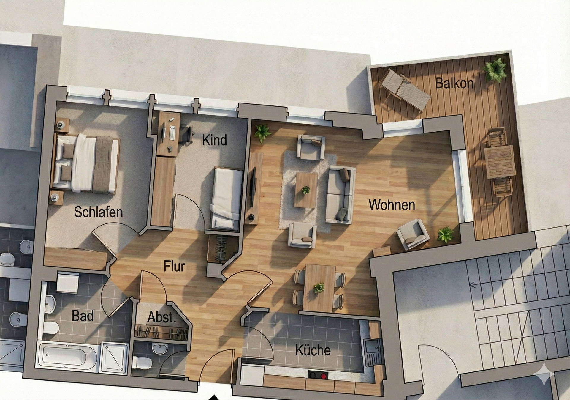 Auf einer Wohnfläche von ca. 82 m² erwartet Sie ein durchdachter Grundriss, der Funktionalität und Behaglichkeit perfekt in Einklang bringt. Das Herzstück der Einheit ist das helle, einladende Wohnzimmer, das durch seine Großzügigkeit besticht und den direkten Zugang zur Küche sowie zum Außenbereich ermöglicht. Alle Räume, einschließlich des Schlaf- und Kinderzimmers, sind zentral über den Flur erschlossen, was eine effiziente Flächennutzung ohne Durchgangszimmer garantiert. Die Wohnräume sind mit zeitgemäßem Laminatboden ausgestattet, der eine gepflegte und wohnliche Atmosphäre schafft und eine ideale Basis für Ihren individuellen Einrichtungsstil bietet.