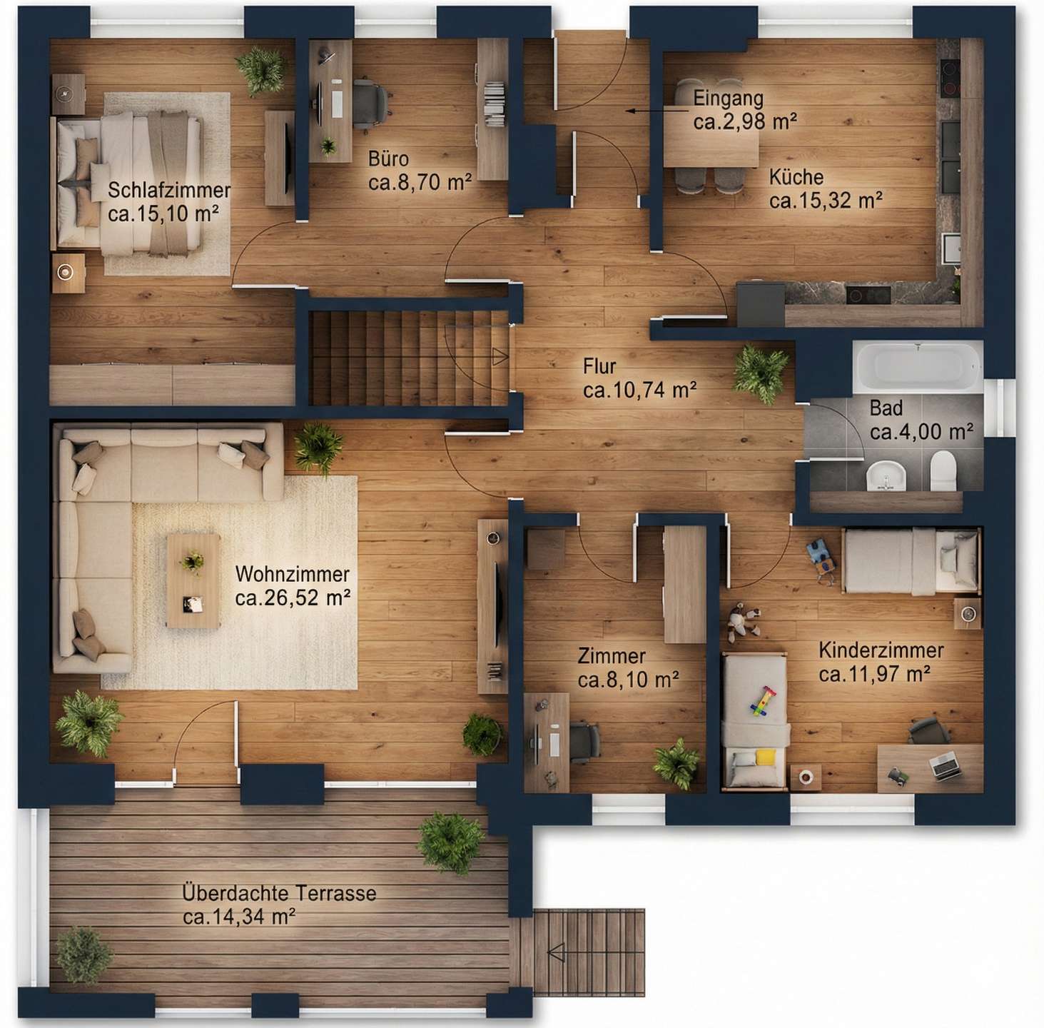 Mit einer Wohnfläche von ca. 107 m² im Erdgeschoss bietet das Haus genau das richtige Maß an Raum für Familien oder Paare mit Platzbedarf. Der Grundriss ist so gestaltet, dass Licht und Funktionalität harmonieren: Das großzügige Wohnzimmer bildet das Herzstück, während die weiteren Zimmer flexibel als Schlaf-, Kinder- oder Arbeitsräume genutzt werden können. Die überdachte Terrasse erweitert den Wohnraum in der warmen Jahreszeit und schafft einen nahtlosen Übergang in den Garten.