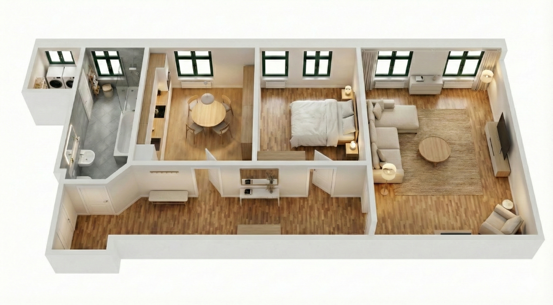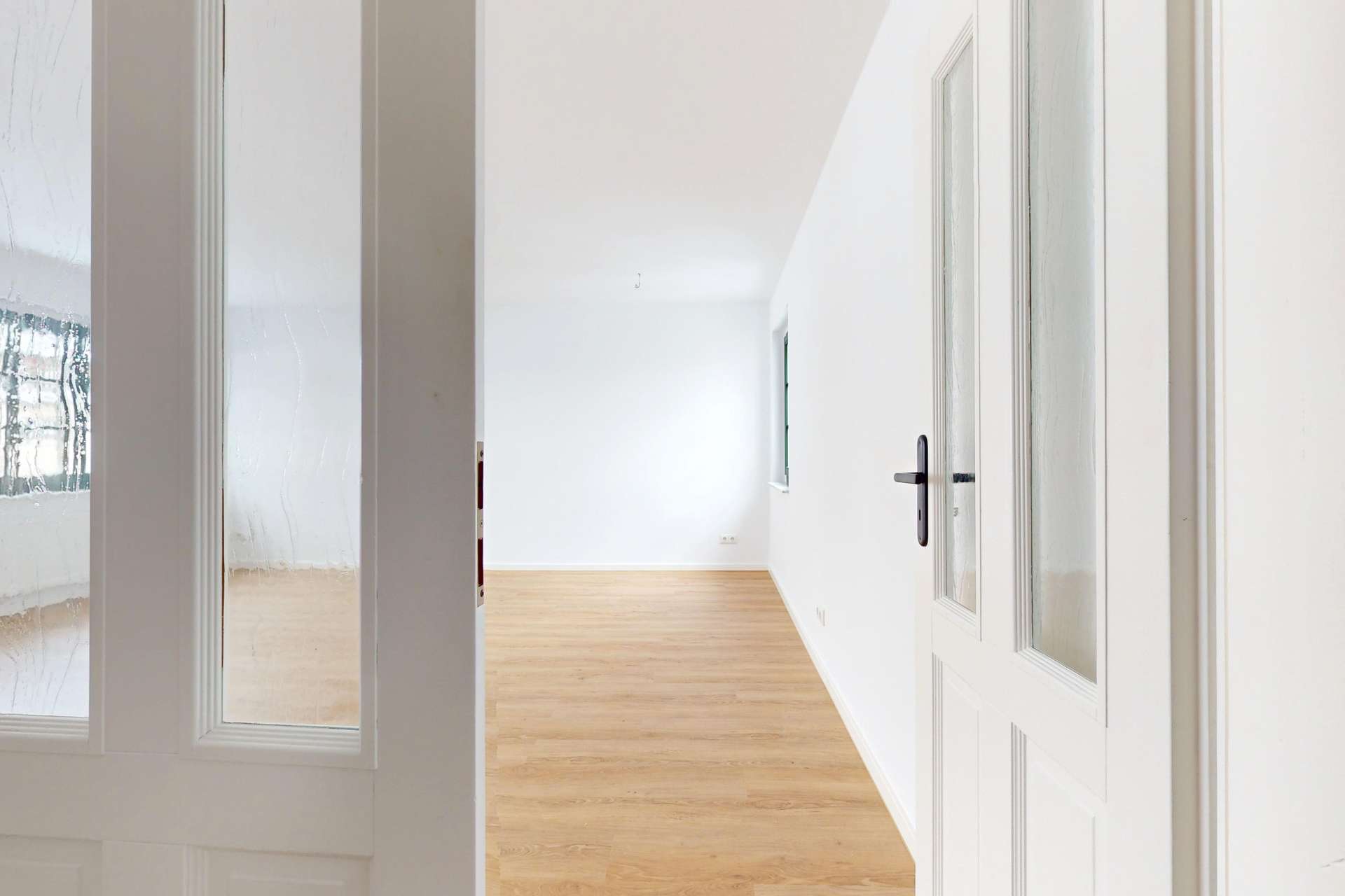 Alle Wände sind glatt gespachtelt, Hochwertiger Vinylboden in Eiche, weiße Holzsockelleisten, neue Elektrik, Bad in hochwertiger Ausführung mit Dusche und halb freistehender Duo-Badewanne, beides mit Thermostatbedienung.